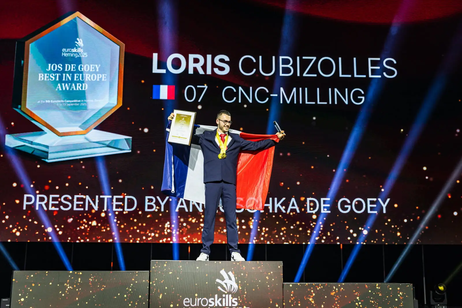 Parmi ces performances remarquables, Loris Cubizolles, un altiligérien formé au Hall 32, et représentant d’Auvergne-Rhône-Alpes a reçu, en plus de la médaille d’or dans sa catégorie (fraisage), le titre de « Best in Europe », récompense attribuée au compétiteur ayant obtenu le score le plus élevé toutes disciplines confondues. La plus prestigieuse distinction qu’un pays peut recevoir, dans cette compétition.