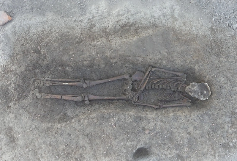 « Tout proche du moulin, dans un espace interprété comme une cour, une sépulture d’un adolescent a été dégagées. Si la période d’inhumation reste encore à définir (avant, pendant ou après le fonctionnement du moulin), la nature du creusement, légèrement trop petit par rapport à la taille du défunt, et sa situation en dehors d’un espace consacré interrogent. »