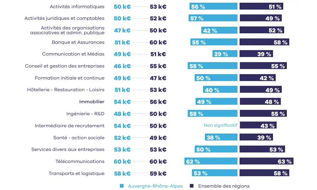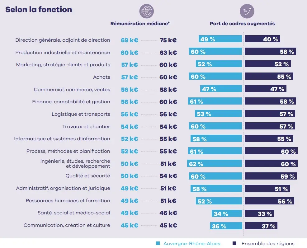 Deuxième région française en termes de création de richesse, l’Auvergne-Rhône-Alpes se distingue par une économie variée mêlant une base industrielle solide (plasturgie, métallurgie, nucléaire) et des services à forte valeur ajoutée (informatique, ingénierie et R&D, conseil, banque-assurance), concentrés principalement dans les grandes métropoles de Lyon et Grenoble. Ces pôles dynamiques, tout comme la proximité de la Suisse, accentuent la concurrence pour les emplois au détriment des entreprises implantées dans les zones moins accessibles de la région. À l’inverse, certaines zones de montagne bénéficient d’une économie portée par un secteur touristique très florissant. Dans ce contexte, les rémunérations des cadres sont plus élevées dans certains secteurs comme l’industrie chimique (65 k€) ou électronique (62 k€) et dans des fonctions spécifiques telles que la production industrielle (60 k€), le marketing et les achats (57 k€).