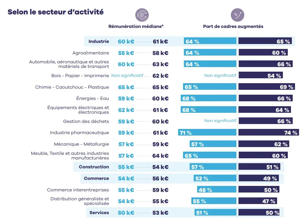 Les cadres ayant effectué une mobilité, interne ou externe, voient leur rémunération plus fréquemment augmenter. En 2025, 64 % des cadres ayant changé d’entreprise (sans passer par le chômage) et 70 % ayant changé de poste au sein de leur entreprise ont été augmentés, contre 49 % n’ayant pas évolué en interne.