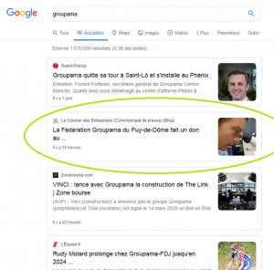 10/09/2020Pour un média d’information, être référencé par Google Actualités est considéré comme le Graal, comme une vraie reconnaissance à la fois de la qualité mais aussi de la diversité des informations publiées. Le Courrier des Entreprises est, depuis l’année dernière, référencé comme média principal d’information, au même titre que La Montagne ou le Figaro.