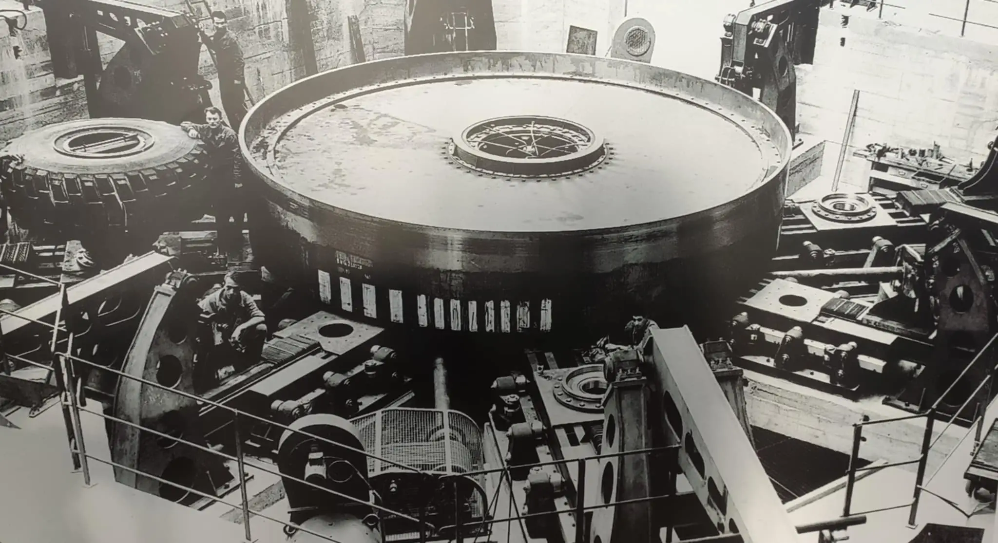 la grande roue centrale tournait à l’horizontale, et les 8 bras équipés de pneus les poussaient contre, avec une pression qui matérialisait le poids des engins agricole et des camions auxquels ils étaient destinés. On peut comprendre la solidité des structures en béton qui restent.